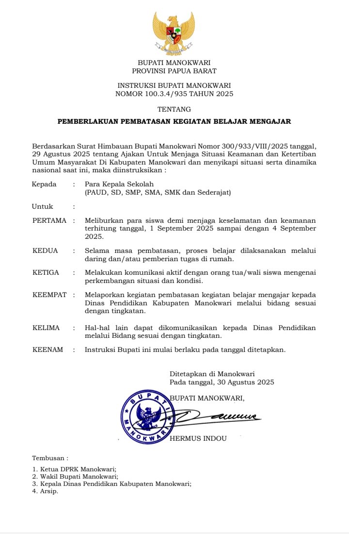 JEJAKPAPUA.COM,MANOKWARI – Bupati Manokwari, Hermus Indou, resmi mengeluarkan Instruksi Bupati Nomor 100.3.4/935 Tahun 2025 terkait pemberlakuan pembatasan kegiatan belajar mengajar di seluruh jenjang pendidikan di Kabupaten Manokwari.