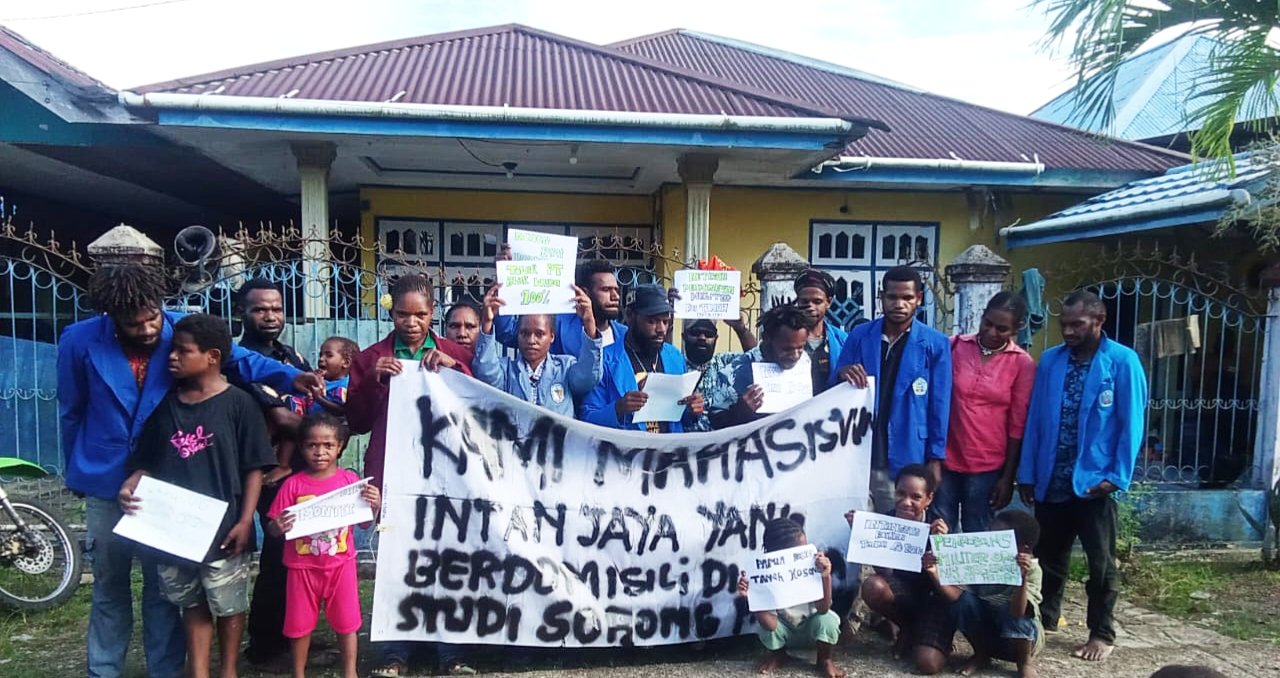 Dalam aksi jumpa pers yang digelar pada Selasa (29/10/2025) di halaman asrama mahasiswa Intan Jaya.