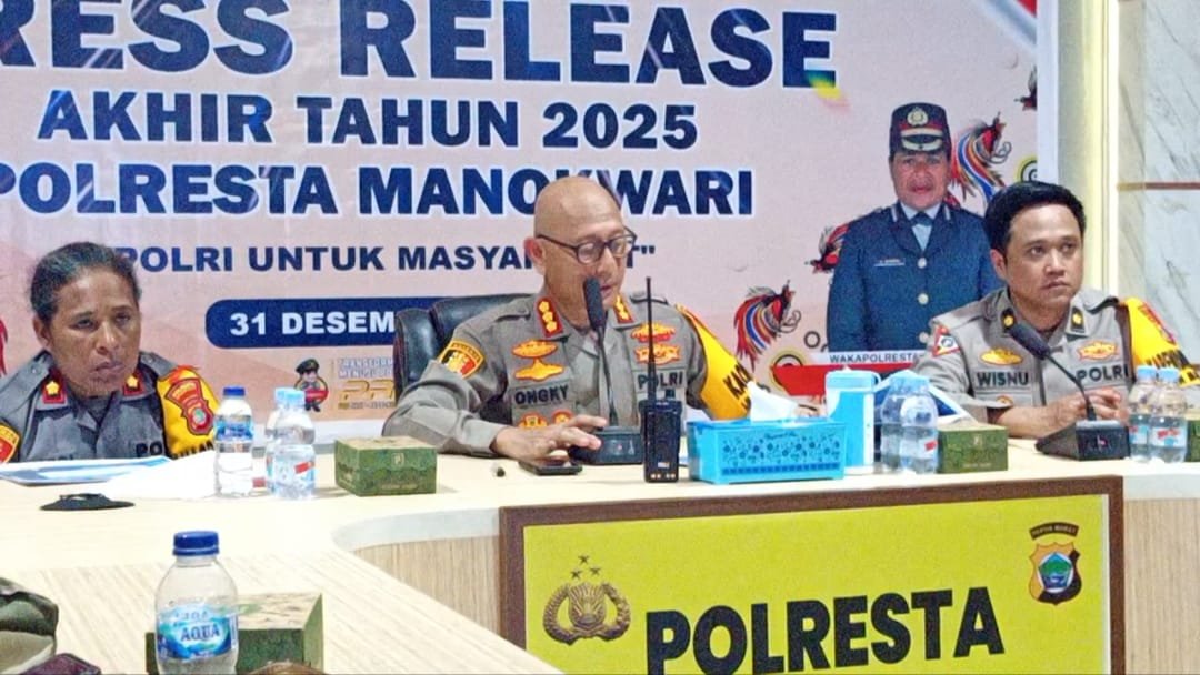 JEJAKPAPUA.COM, MANOKWARI – Polresta Manokwari mencatat peningkatan kasus kejahatan sebesar 53 persen sepanjang tahun 2025. Hal tersebut disampaikan dalam press release akhir tahun 2025 yang digelar Polresta Manokwari sebagai bentuk publikasi kinerja dan capaian Polresta Manokwari bersama Polsek jajaran selama satu tahun terakhir.