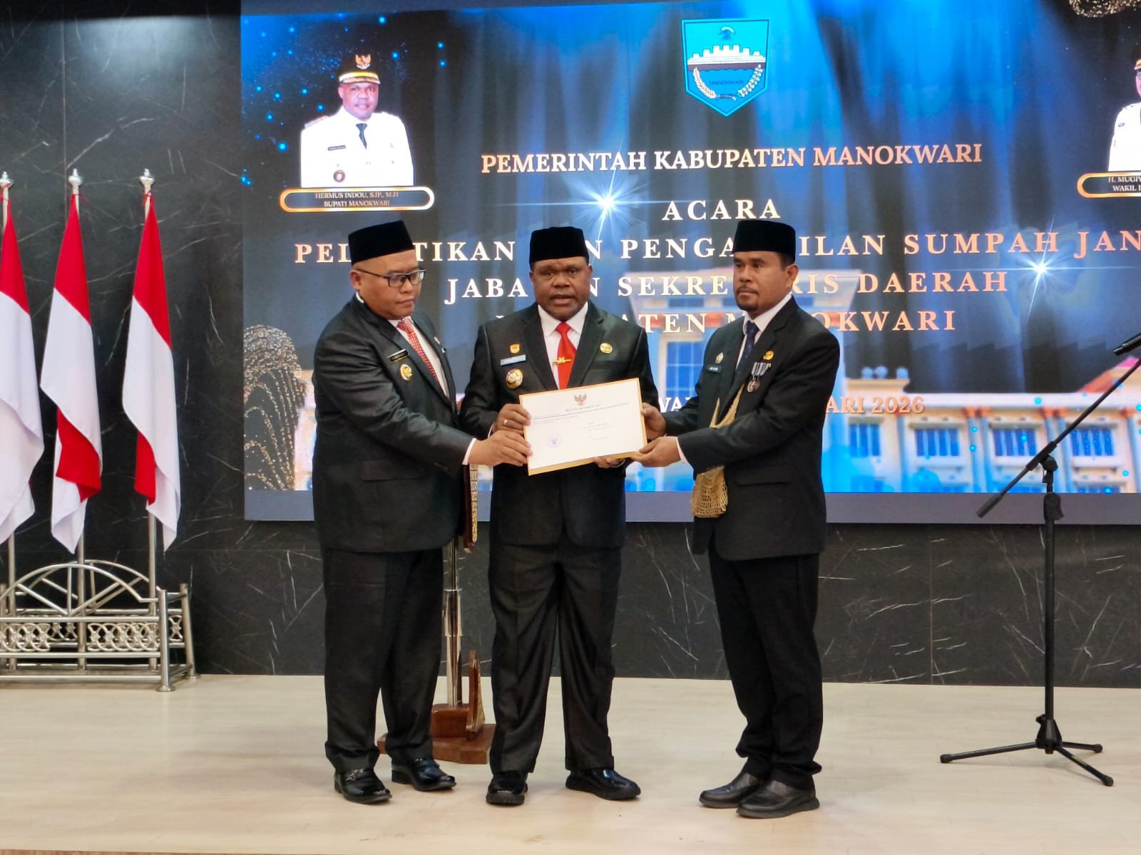 JEJAKPAPUA.COM.MANOKWARI – Bupati Hermus Indou resmi melantik Yan Ayomi sebagai Sekretaris Daerah (Sekda) Kabupaten Manokwari, Rabu (18/2/2026).